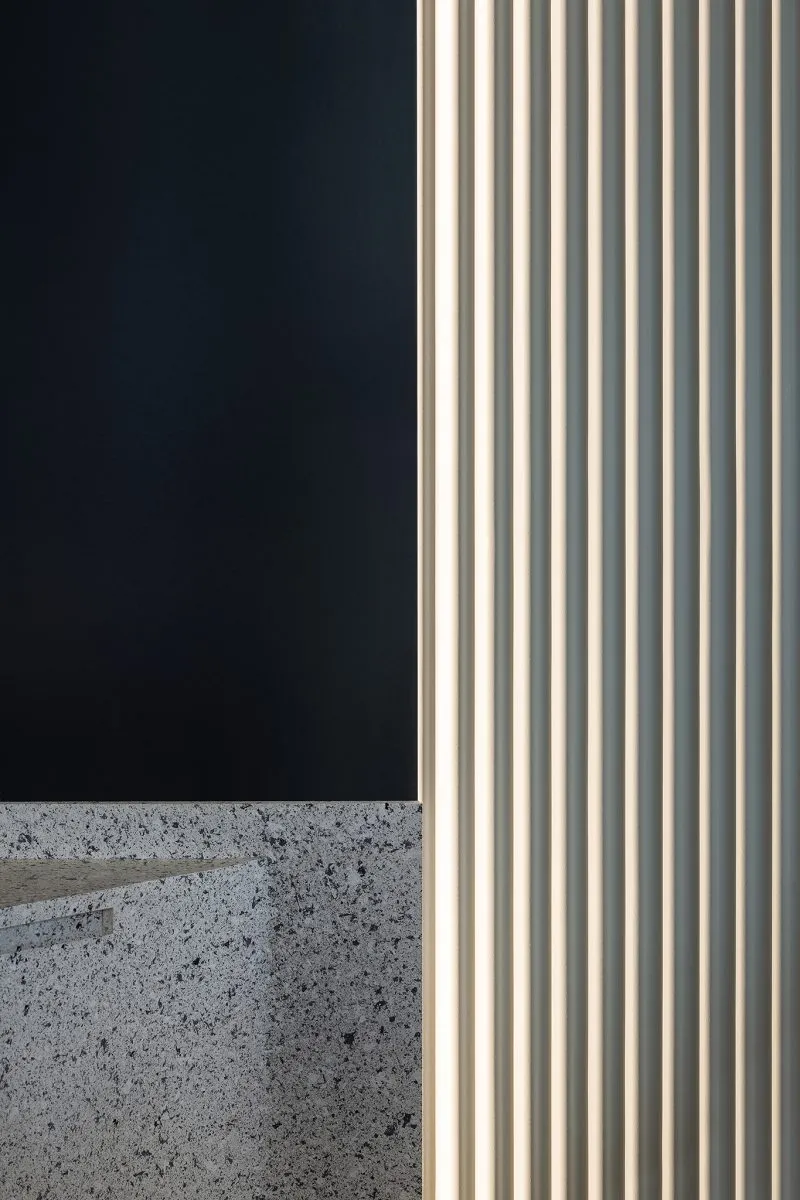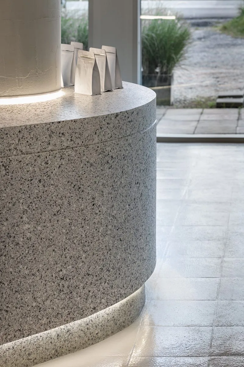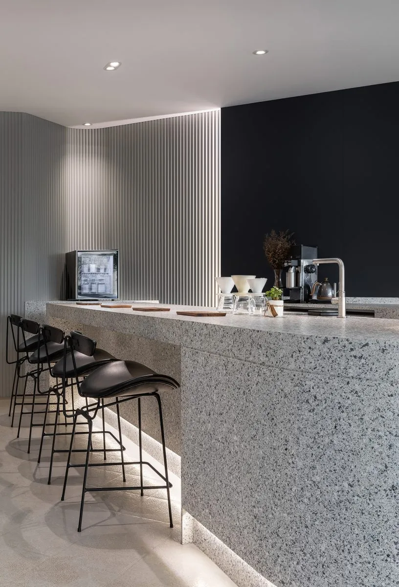 · Texture-coated bar surface mimicking terrazzo stone on wood structure