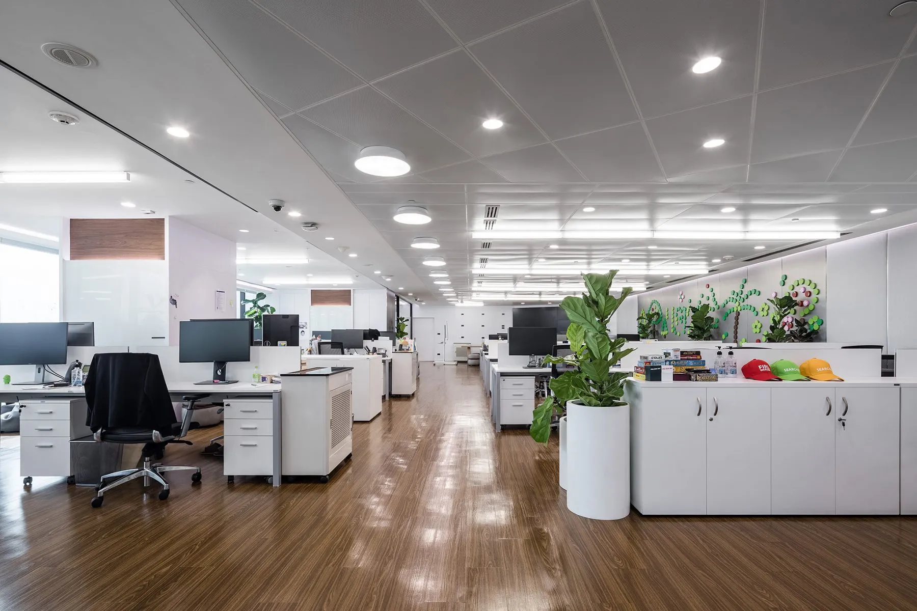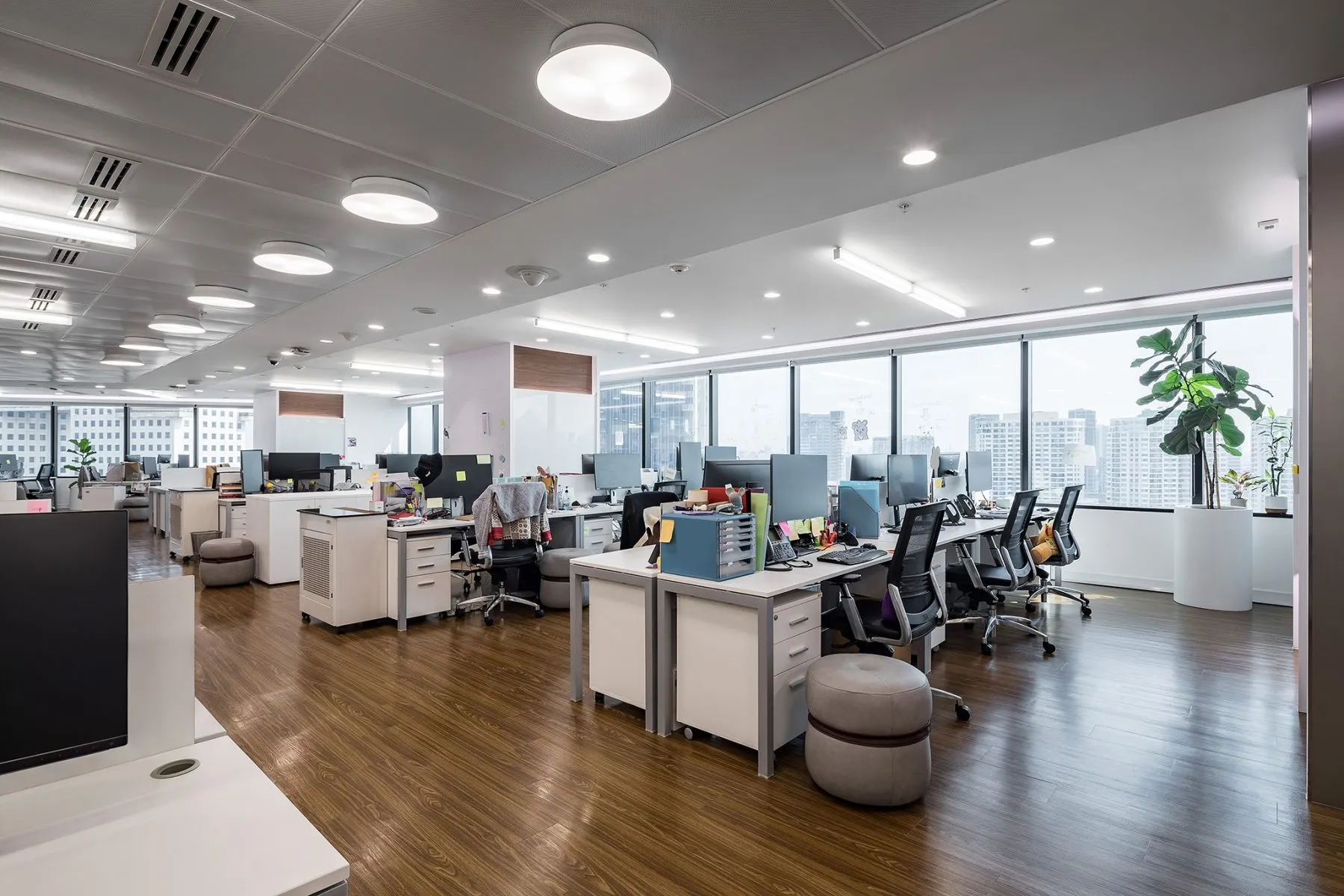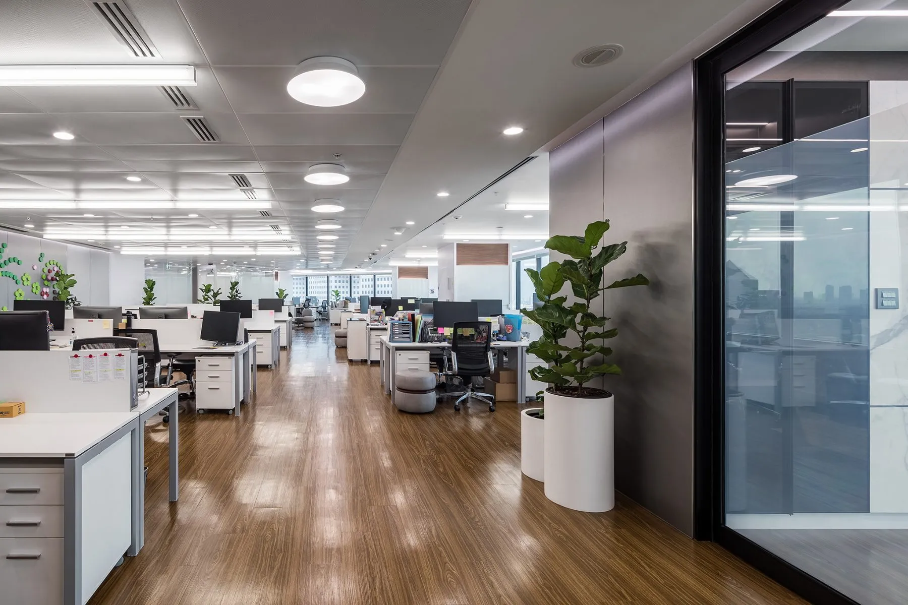 Despite being within a high-rise complex, window openings and glass insertions bring in natural light and offer glimpses of the exterior, reminding staff of context beyond the screens.