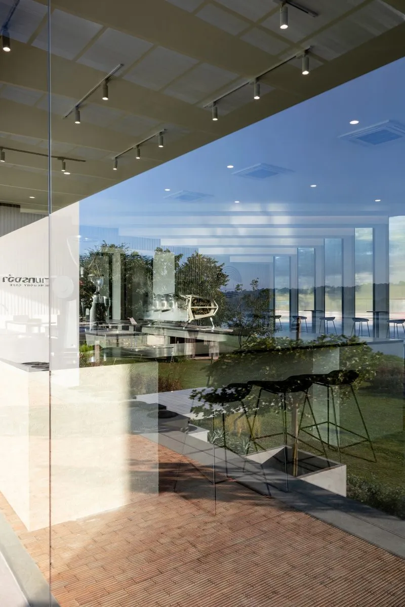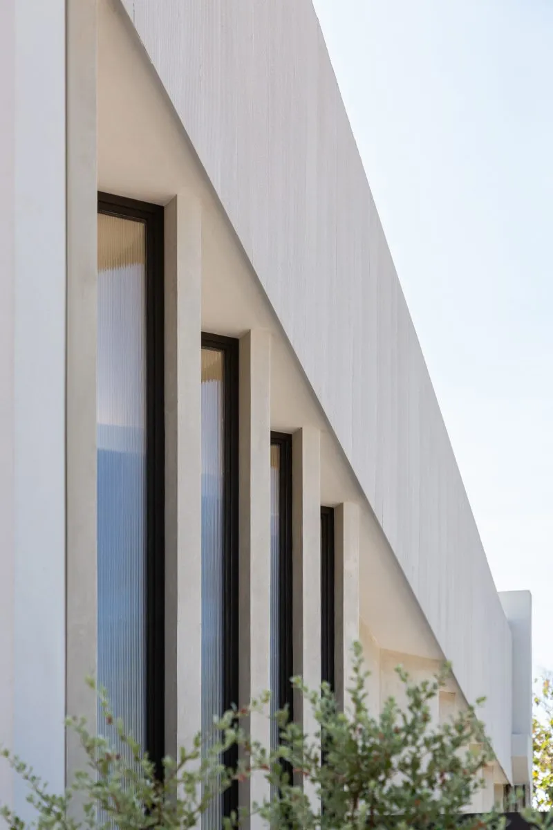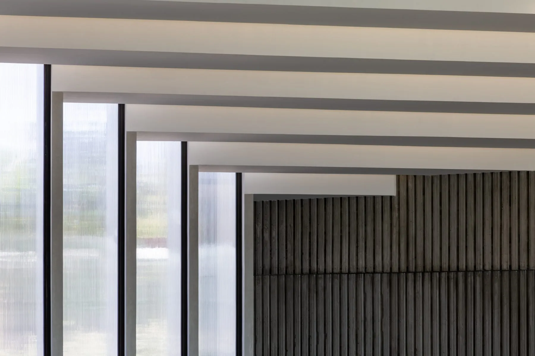 From the outside, a rhythmic façade of angled concrete fins and frosted polycarbonate panels conceals the interior view.