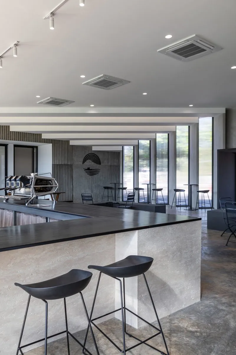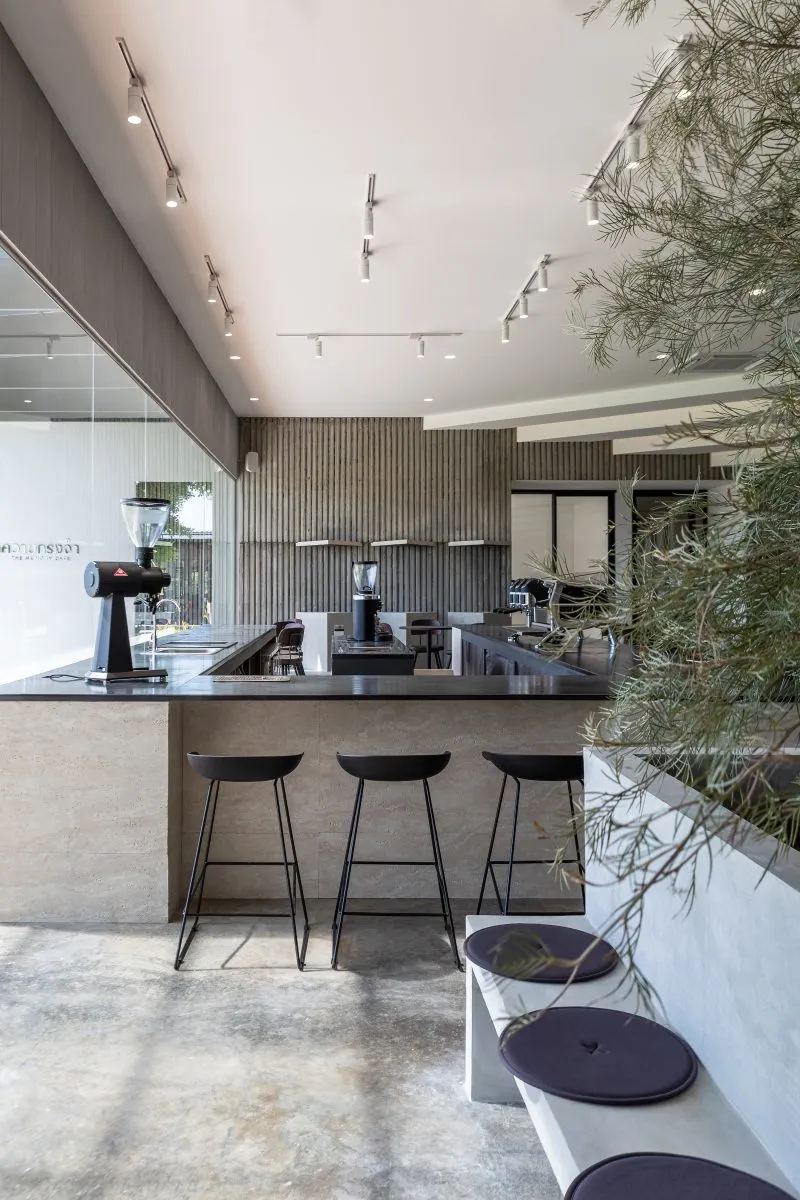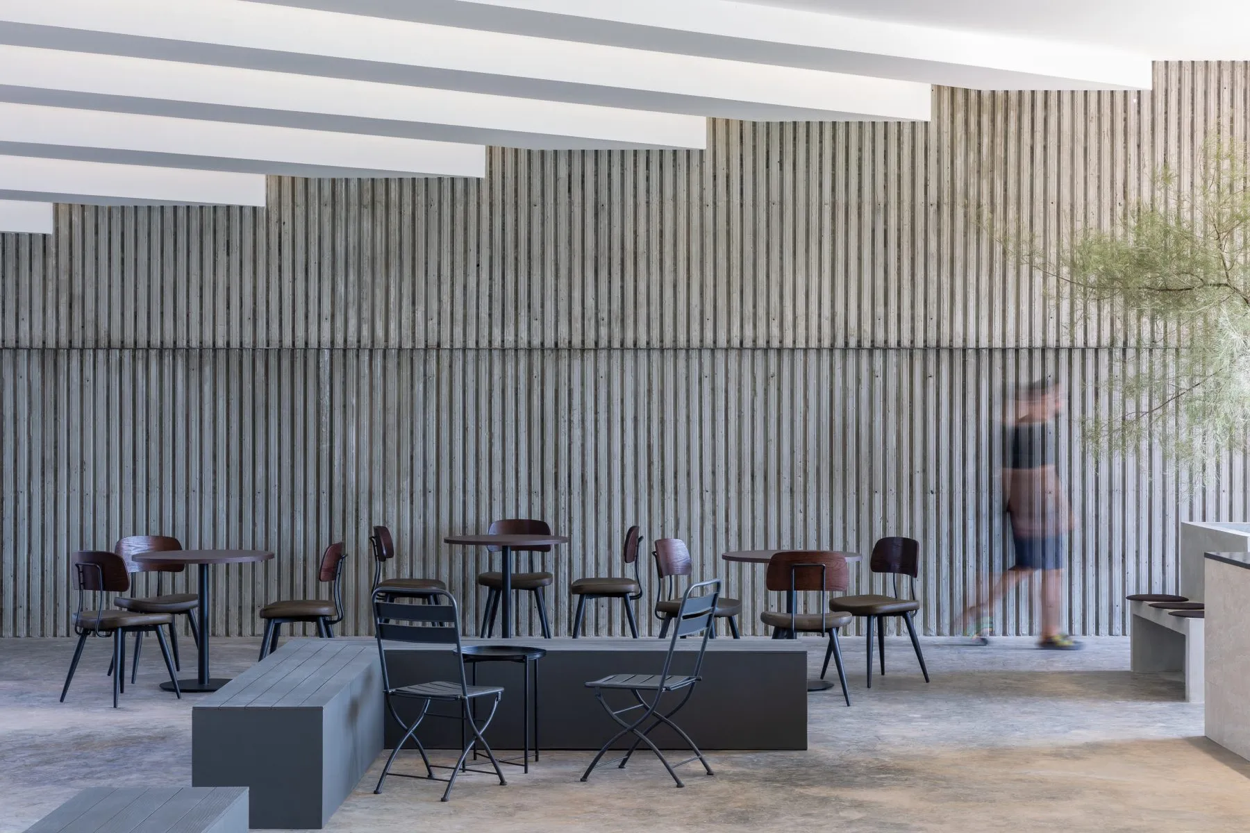 The café employs an exposed-material palette: reinforced concrete, steel roof framing, skim-coated smart board, and raw steel countertops sealed with clear lacquer.