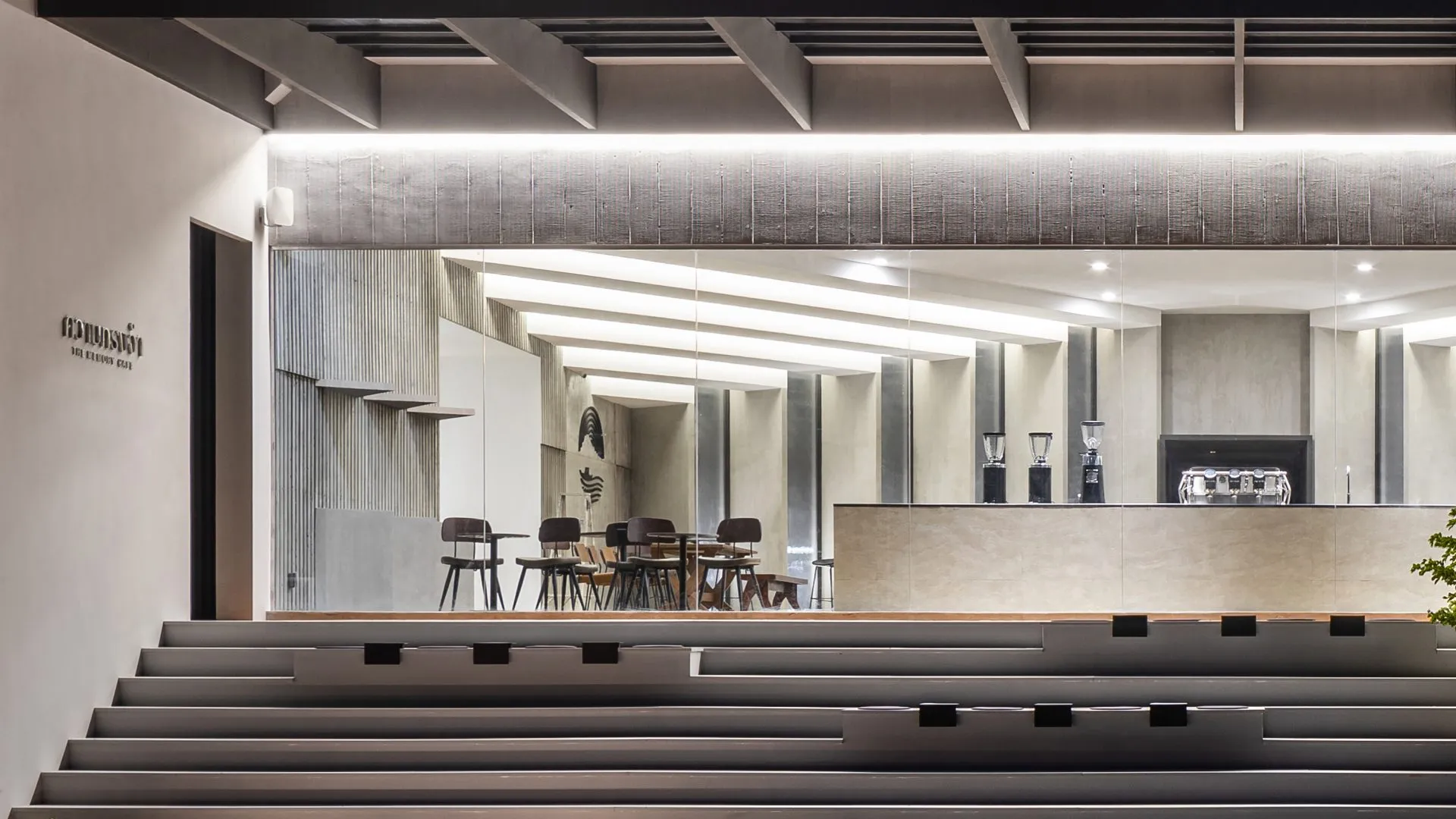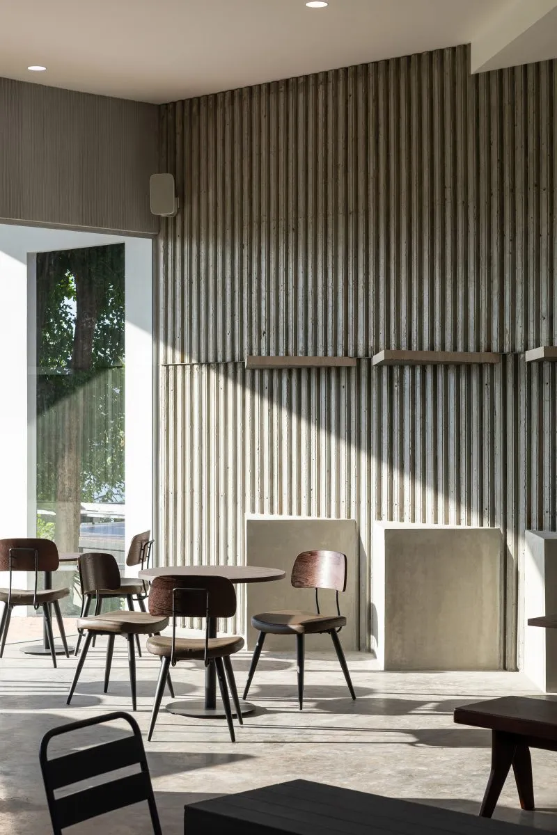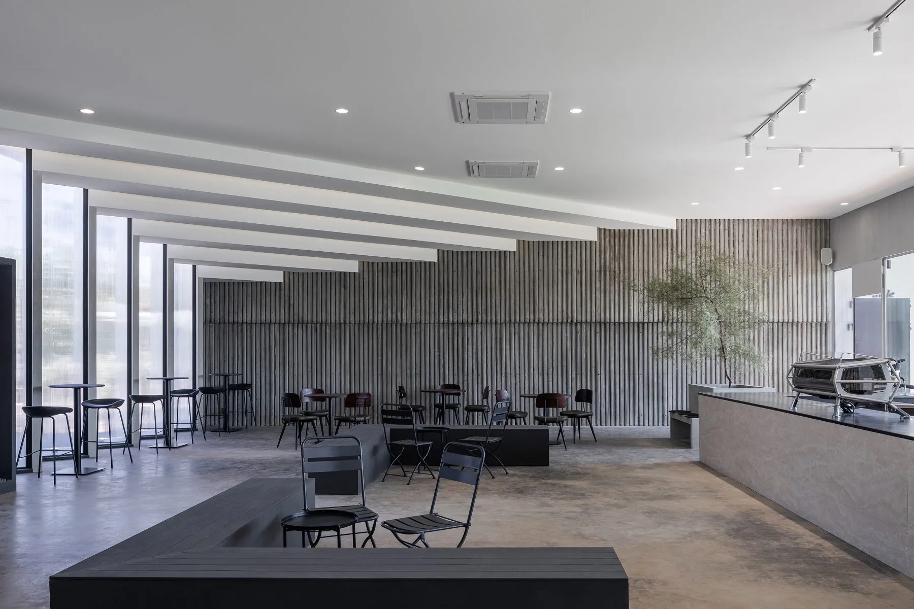 The café employs an exposed-material palette: reinforced concrete, steel roof framing, skim-coated smart board, and raw steel countertops sealed with clear lacquer.