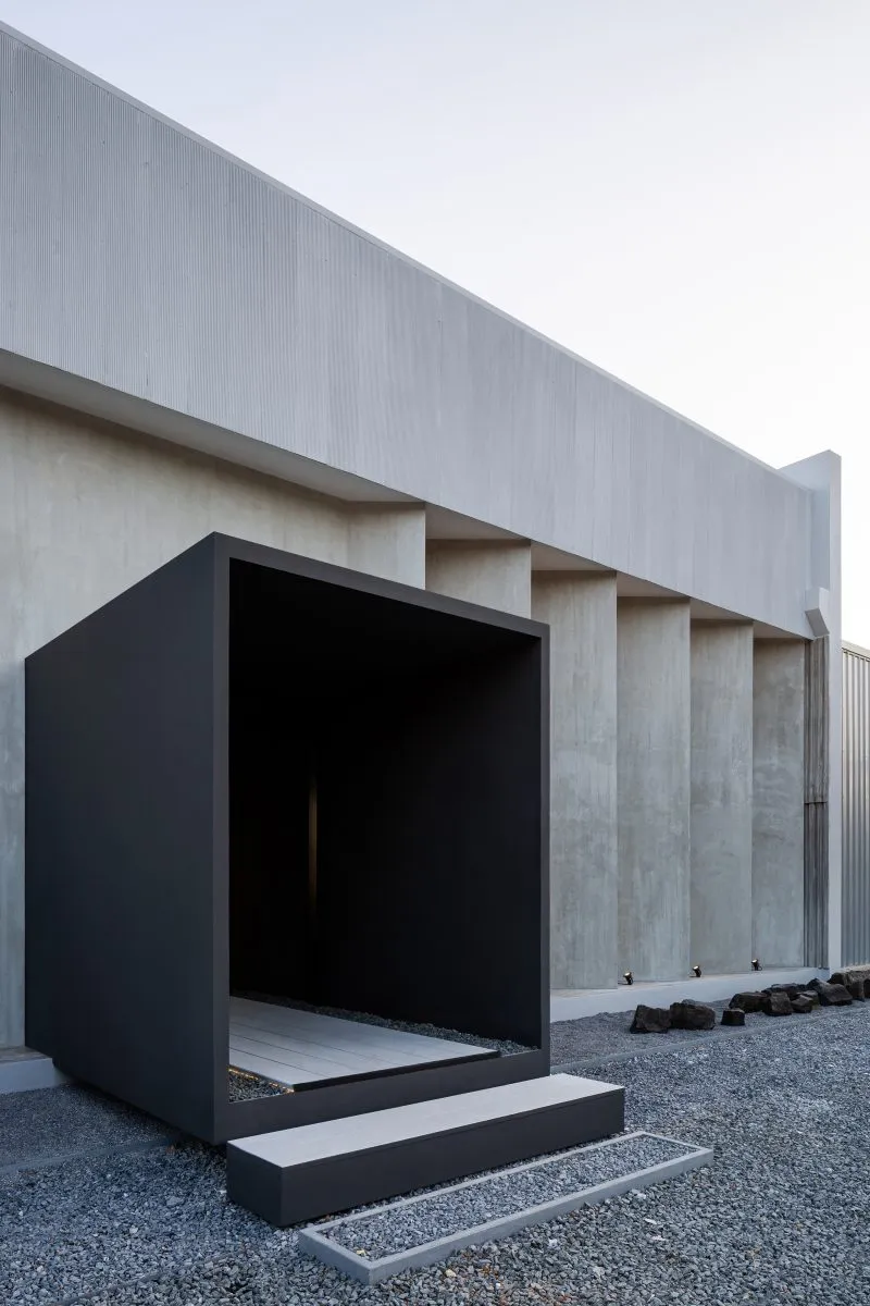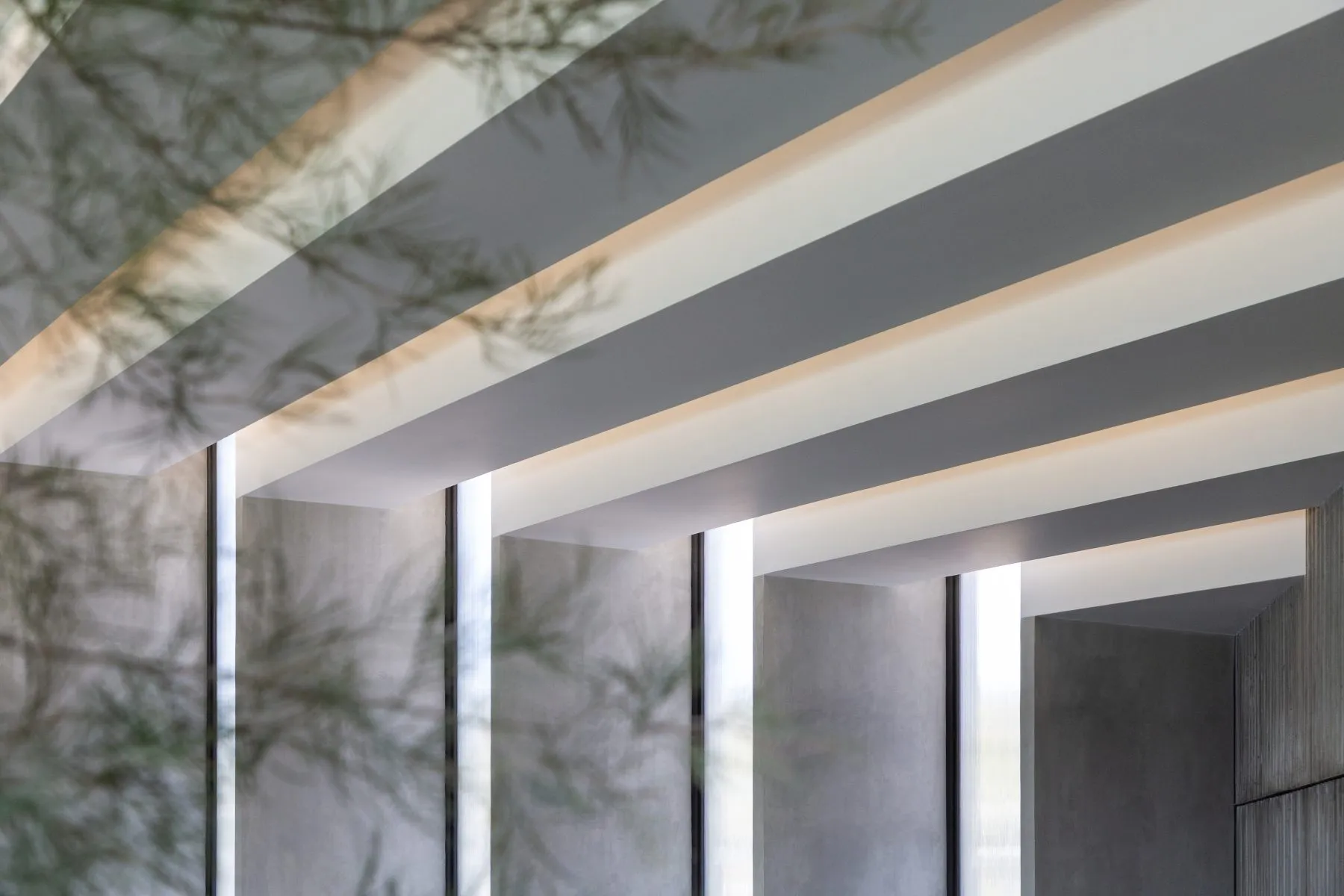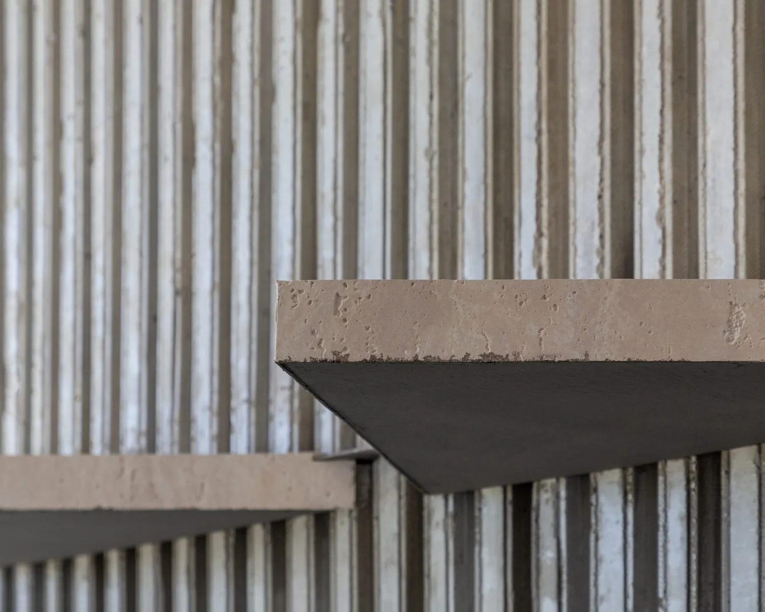 The textured concrete wall was cast in situ with custom vertical molds, adding shadow depth and softening the long perspective of the space.