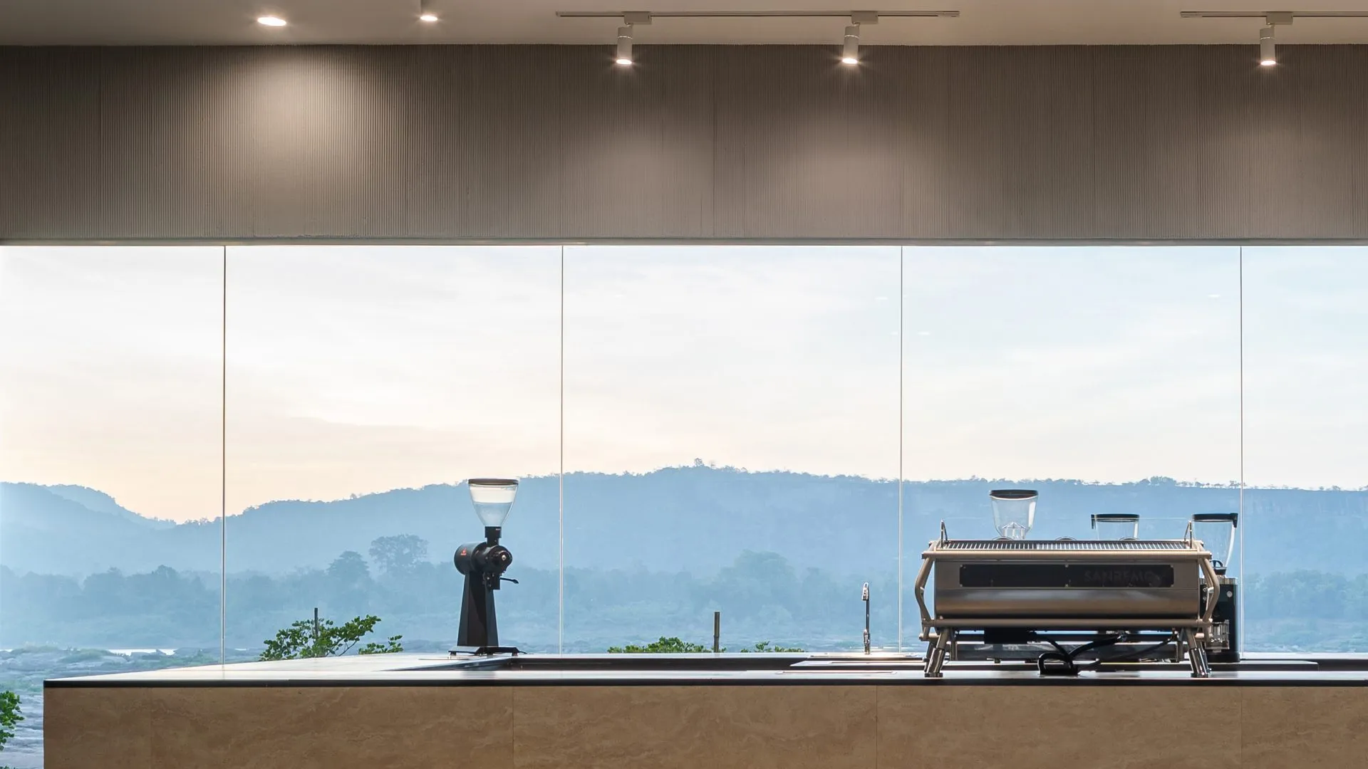 The entry sequence was thus designed as a viewfinder: a framed path where the coffee bar and river view align into a single composition.
